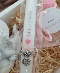 Geschenkebox zur Taufe, Erstkommunion oder Firmung bestehend aus Schutzengel, Rosenkranz, Kreuz, Wunscherfüller Geldbeutel und Glückslicht Stabkerze Bitte den Anlass in der Anmerkung im Warenkorb angeben