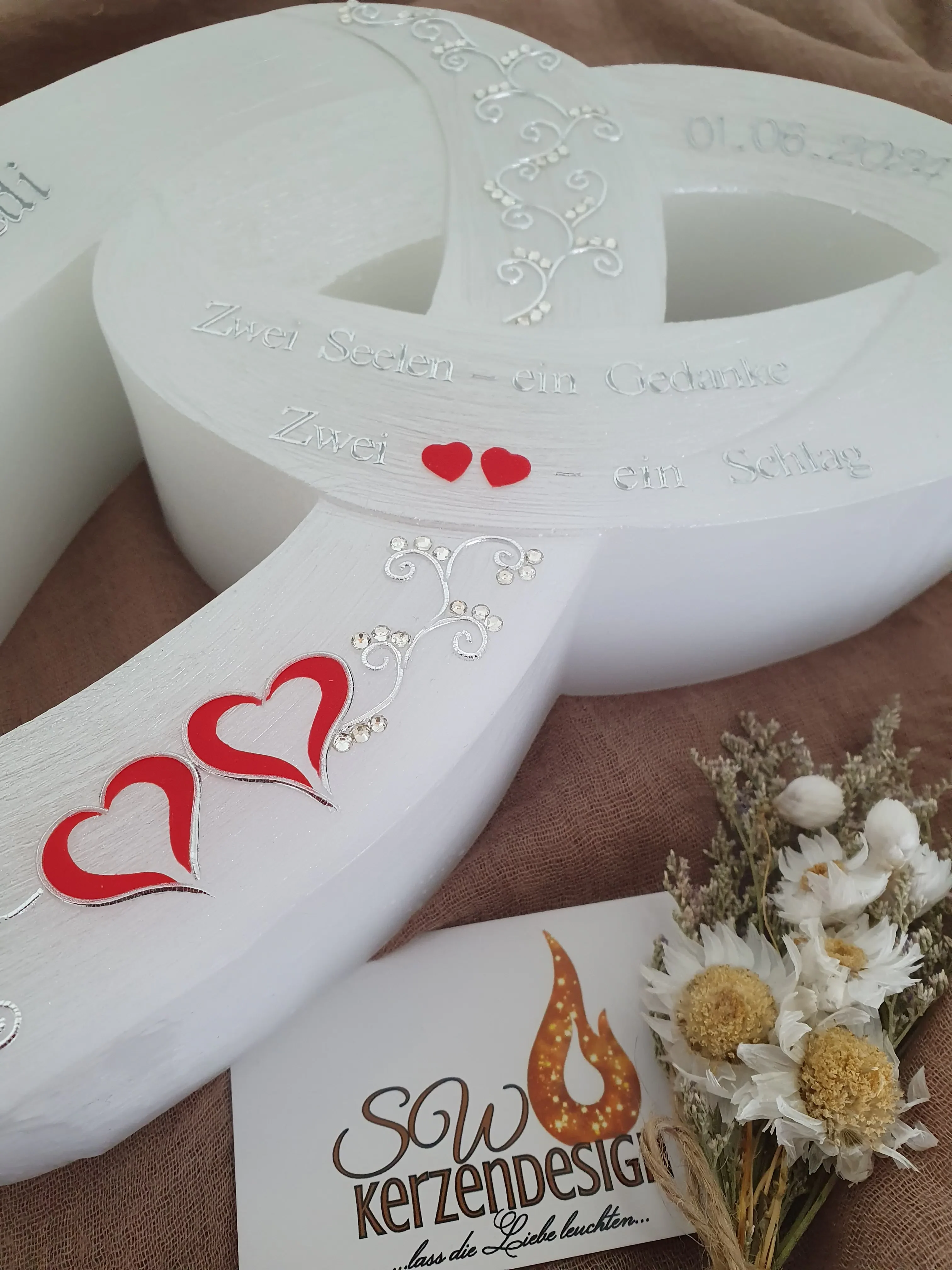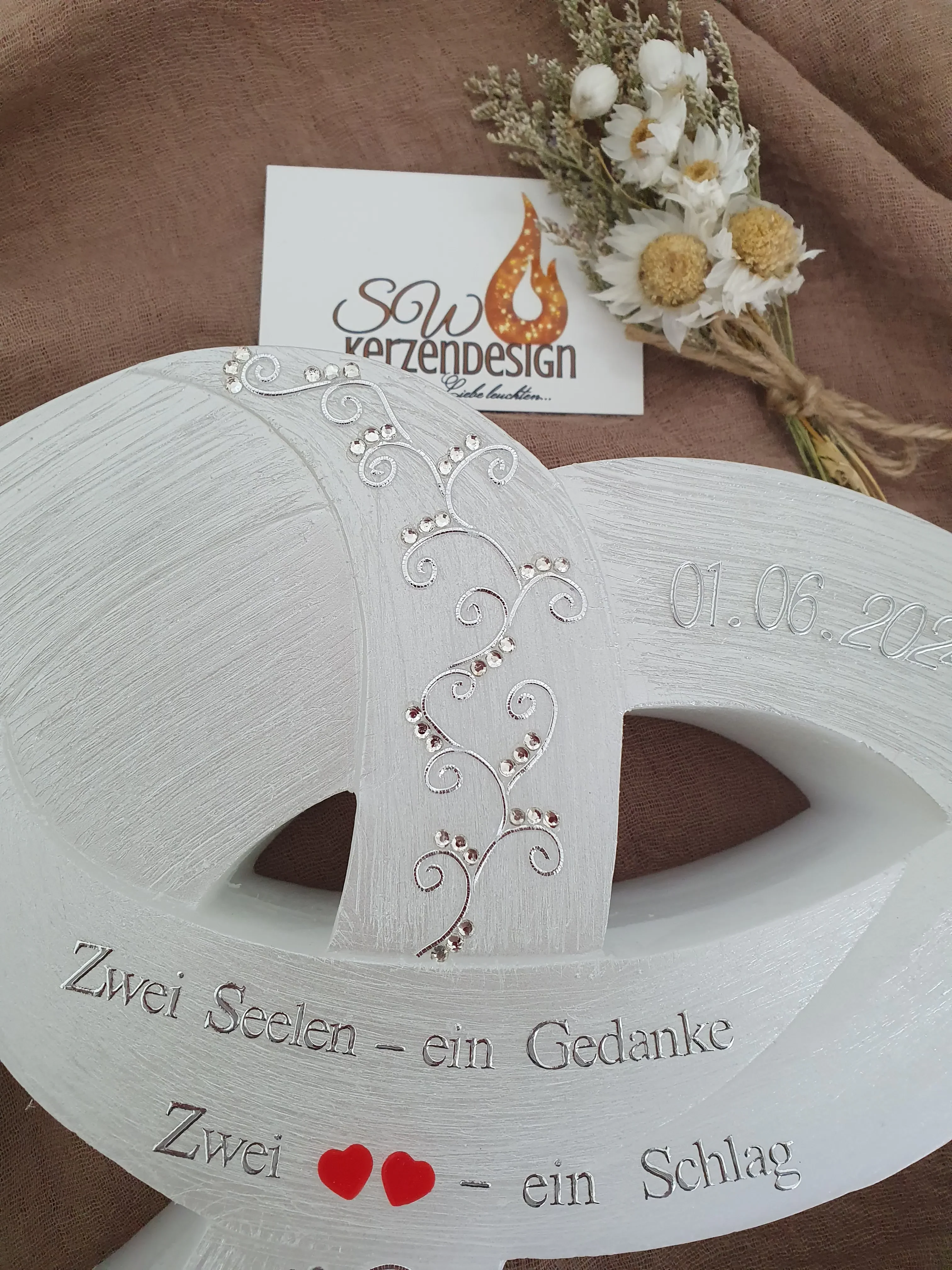 Hochzeitskerze Doppelringe „Ranken mit Strasssteinen und Herzen“