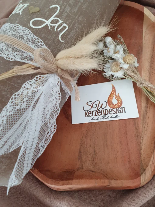 Kerzengröße: 21x15x8cm oval Die Kerze verfügt über 2 Teelichteinsätze Sie besteht aus Wachs mit eingearbeiteten Echtholz Verzierung besteht aus aufwendiger Acrylmalerei bis ins feinste Detail